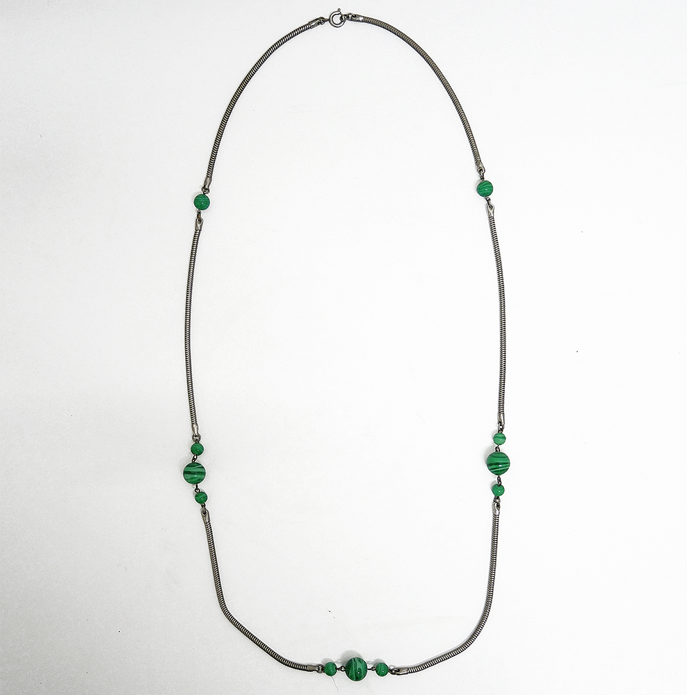 1950s stylish long necklace, chrome-plated brass with malachite-coloured glass beads, approx. 6–12 mm in diameter, total length approx. 89 cm, 42 g.