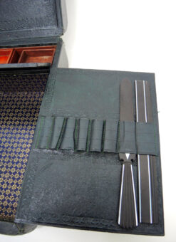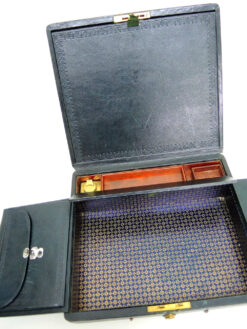 Art Deco, letterwriting set, leather/wood, paper, used, leather etui, inkwell, letter opener and ruler wood with mother of pearl inlay, collector’s item