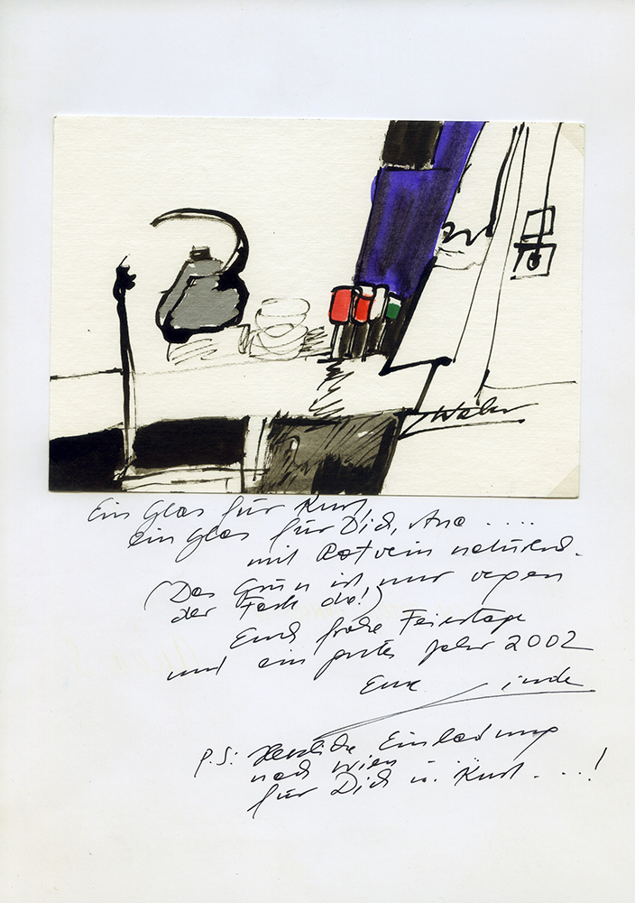 Holiday greeting, 2001/02, mixed media ink, A4 sheet, card approx. B6 12.3×17.2 cm, in Halbe magnetic frame A4