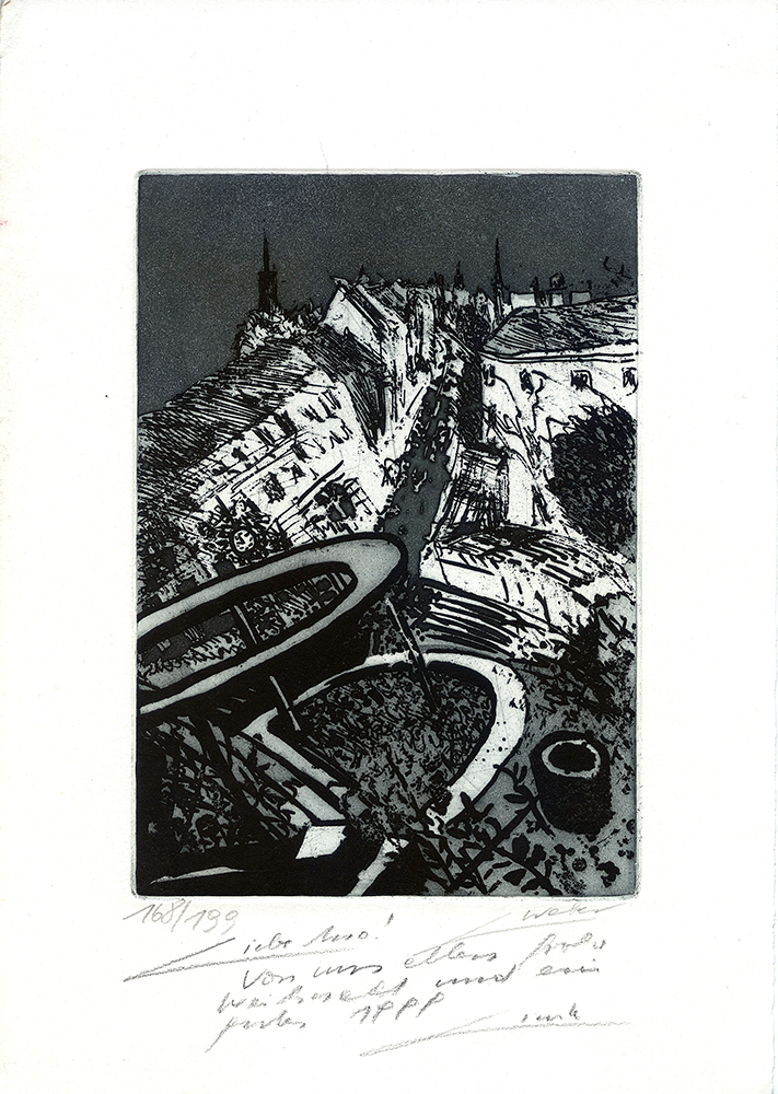 Holiday etching, 1998/99, etching 168/199, sheet A4, plate approx. 19.7×13.7cm, in half magnetic frame A4, greeting can be erased.