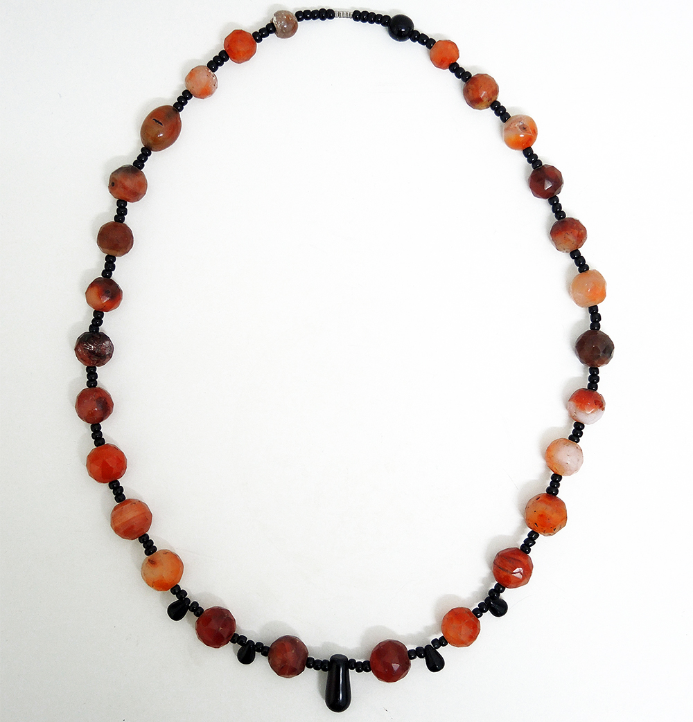 Wonderful Ancient Egyptian faceted carnelian beads, from a tomb, with a modern glass extension to create a long necklace, a gift from a couple of geologists, Ø approx. 12–18 mm, total length approx. 76 cm, 187 g.