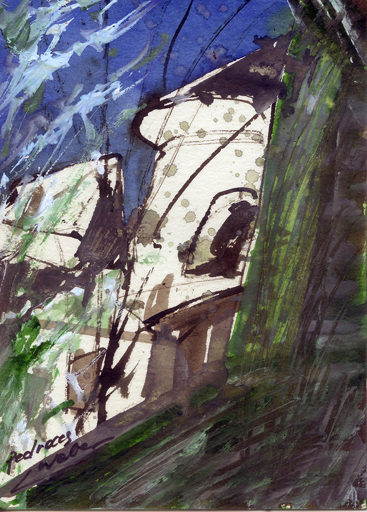 Pedraces, Alta Badia, 2004, gouache/ink/paper, 15×10.5 cm, in postcard frame/anti-reflective glass